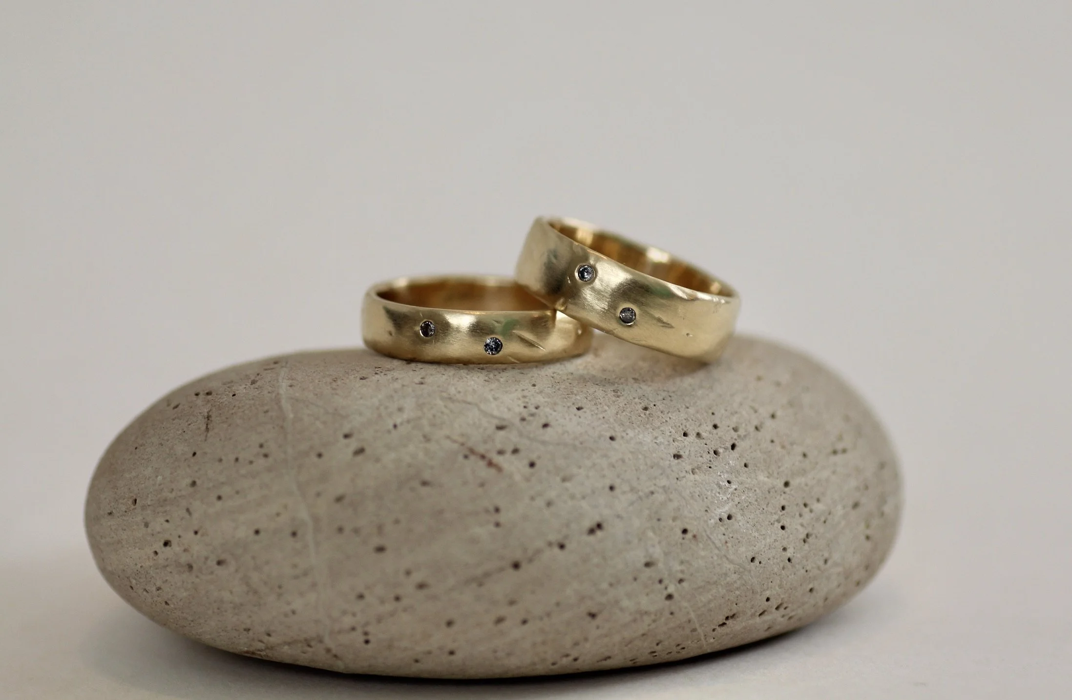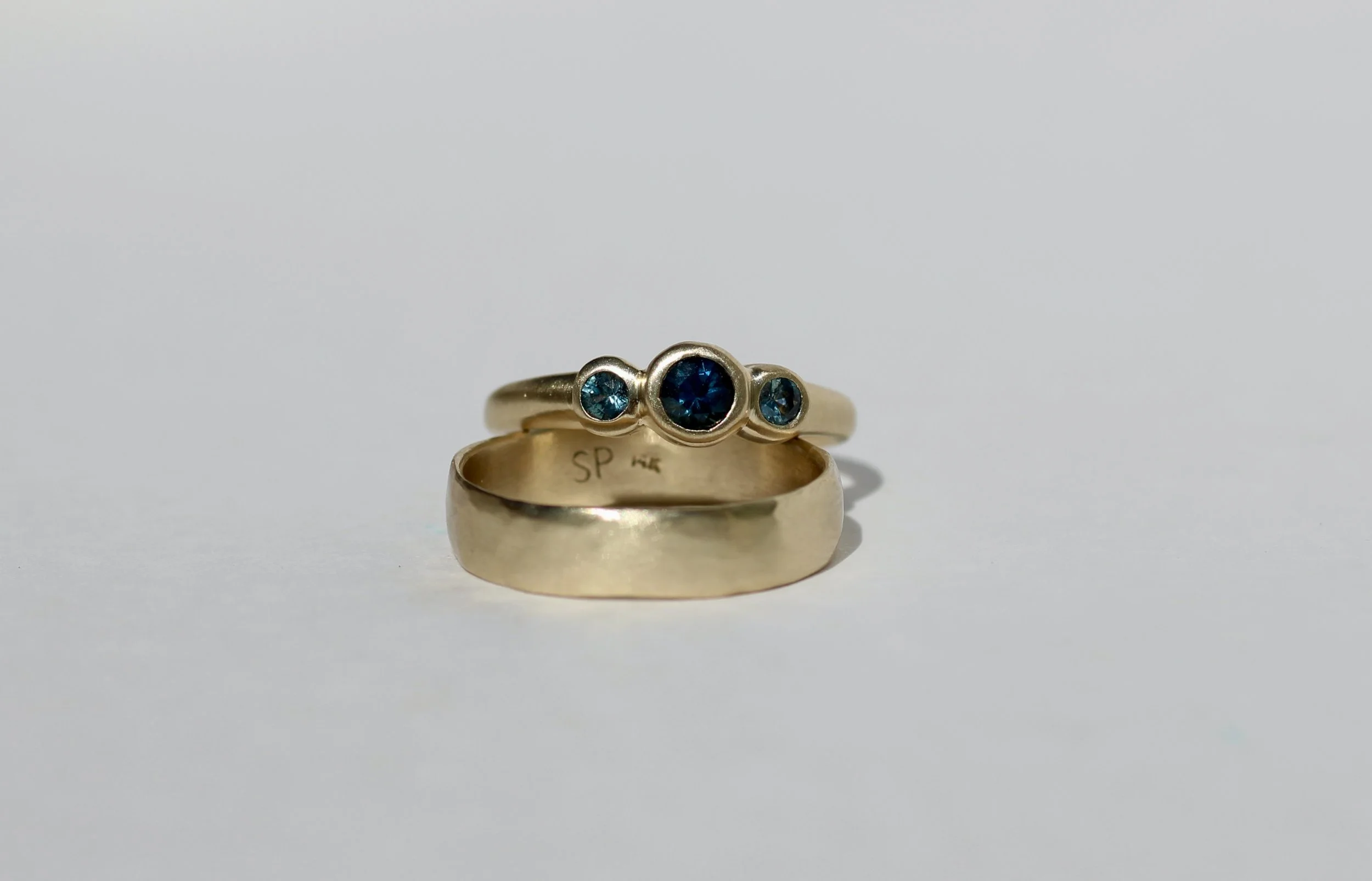 “Sarah Pardee made wedding bands for me and my husband. She is creative, collaborative, patient, efficient, original, and such a joy to work with! As two river guides, we ended up with deeply personal and meaningful custom rings that have the texture of river rocks and an engraving depicting the river we got engaged on, with a little Montana Sapphire marking our campsite. It's so special that these are the only two rings of their kind in the world and that they have so much of *us* embedded in their design, yet they're stunning even to those who don't know their meaning. I also have several pairs of earrings made by Sarah because I'm continually drawn to the organic shapes she uses in her jewelry. She's truly a master of her craft!” -Noa B.